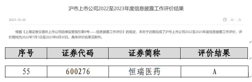 近日,上海交易所公布了沪市上市公司2022-2023年度信息披露工作评价结果,凭借在信息披露、规范运作以及投资者关系管理等方面的优秀表现,金年会医药获评A级。本次共有2160家沪市上市公司参评(包括499家科创板上市公司),评价等级从高到低依次为A、B、C、D四类,获得A类评价的上市公司占比约18.5%。